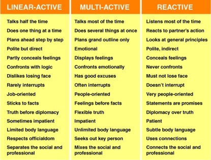 Linear-actives — those who plan, schedule, organize, pursue action chains, do one thing at a time. Germany, Switzerland, and the U.S. are in this group.